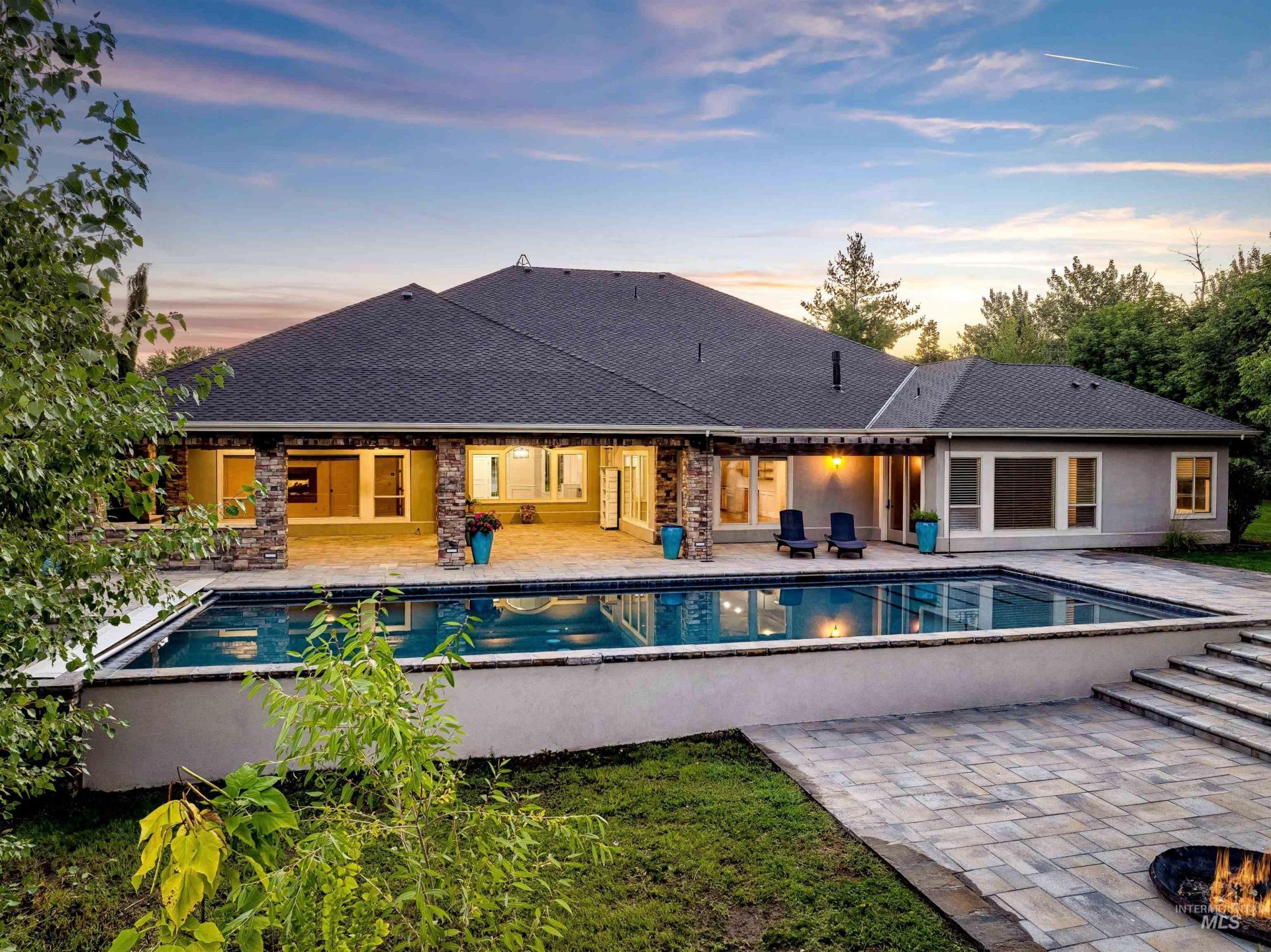 OPEN HOUSE: SATURDAY 1:00-4:00 and SUNDAY 11:00-2:00 - Luxurious Sanctuary with River Access & Resort-Style Living--Discover 103 S. Alder Lane, a rare estate tucked away on ONE acre with pond frontage and Boise River access. This spacious single-level home with bonus room offers fresh interior paint, refinished hardwood floors, and soaring ceilings that create a warm yet sophisticated feel. Designed for flexibility, it features dual master suites ideal for multi-generational living or extended guests. The gourmet kitchen opens to a generous great room with serene backyard views, while a dedicated media room and large bonus space above the garage add even more options for work or play. Outdoors, enjoy resort-style amenities including a ~3,000 sq/ft patio, 20x50 heated saltwater pool, built-in kitchen, and firepit overlooking the water. A massive 6-car garage provides ample space for vehicles, toys, and storage. One-of-a-kind entertainers dream located in one of Eagles most sought-after hidden settings-without restrictions of an HOA.
