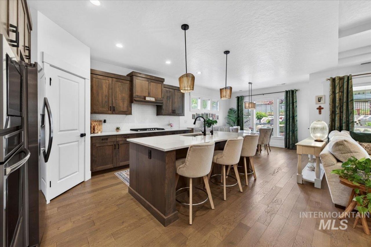 Welcome to this beautifully upgraded home in Redhawk Ridge, a move in ready Nampa Idaho home for sale showcasing refined finishes, elevated design, and thoughtful upgrades throughout. Featuring a water softener and reverse osmosis RO water filtration system, this home is ideally located near Redhawk Ridge Golf Course, offering convenient access to golf and recreation. The open concept layout blends comfort and sophistication, anchored by a luxurious primary suite with a spa inspired tiled walk- in shower, dual vanities, and an oversized walk- in closet connected to the laundry room. The great room is enhanced by rich hardwood floors, expansive windows, and natural light, creating an inviting and elevated living space. The kitchen is a true focal point, featuring a statement quartz island, stainless steel sink, five burner gas cooktop, custom cabinetry, and a spacious walk- in pantry designed for both function and style. Relax on the covered patio with an extendable shade system, overlooking a beautifully terraced, low maintenance backyard designed for seamless outdoor living. Residents enjoy a community pool and thoughtfully designed walkable and golf cart friendly paths throughout the neighborhood.